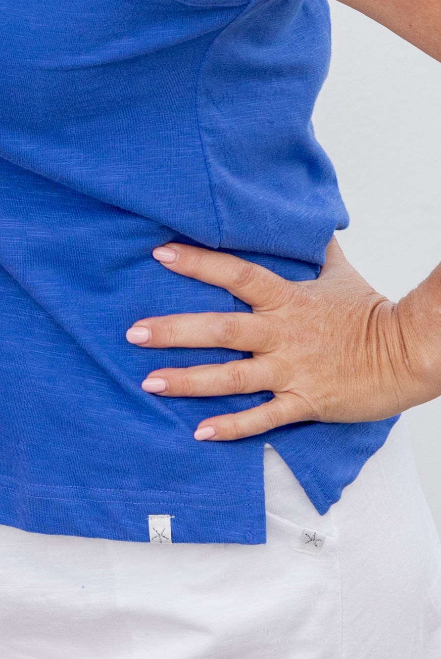 This tank top is a shorter length fit, so that it finishes at the high hip - it means you never need to tuck it in. The colors are dyed to match all of the other items in our collection, so it looks adorable worn with all of our skirts, pants, and skorts.