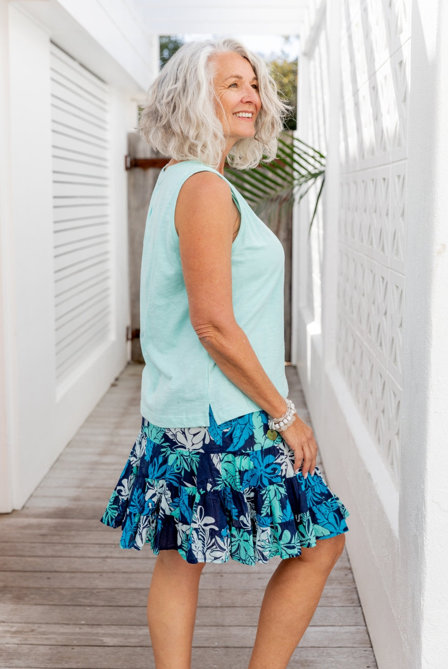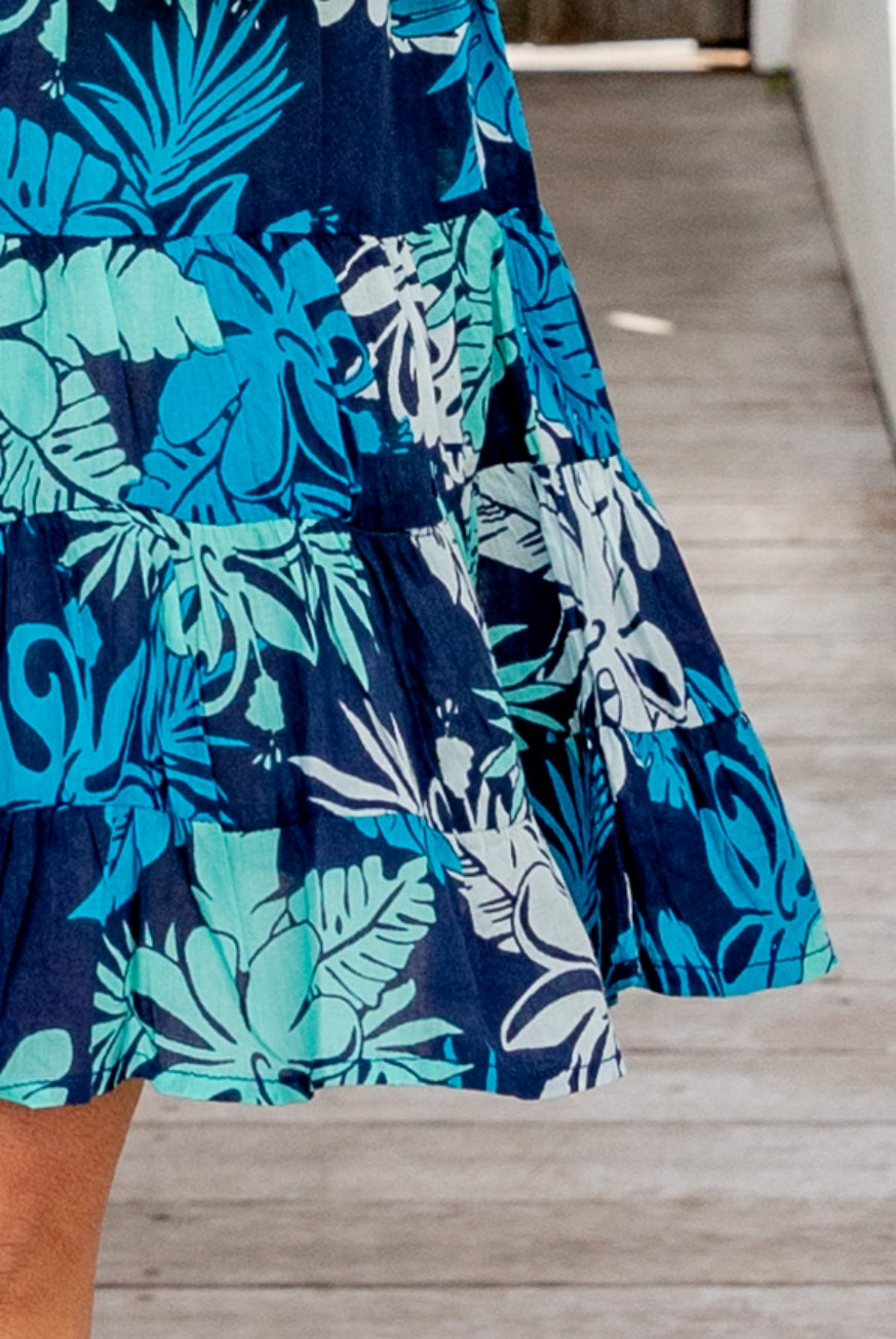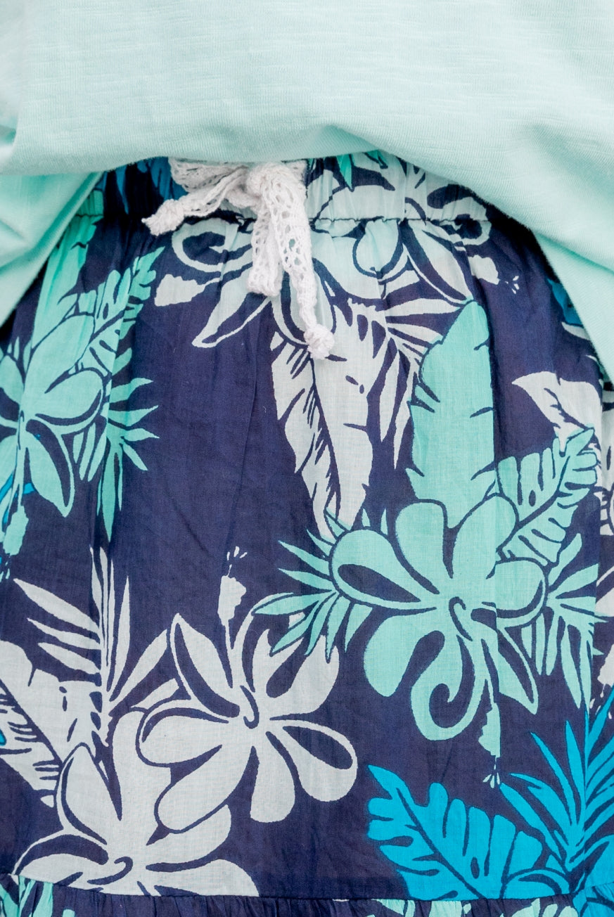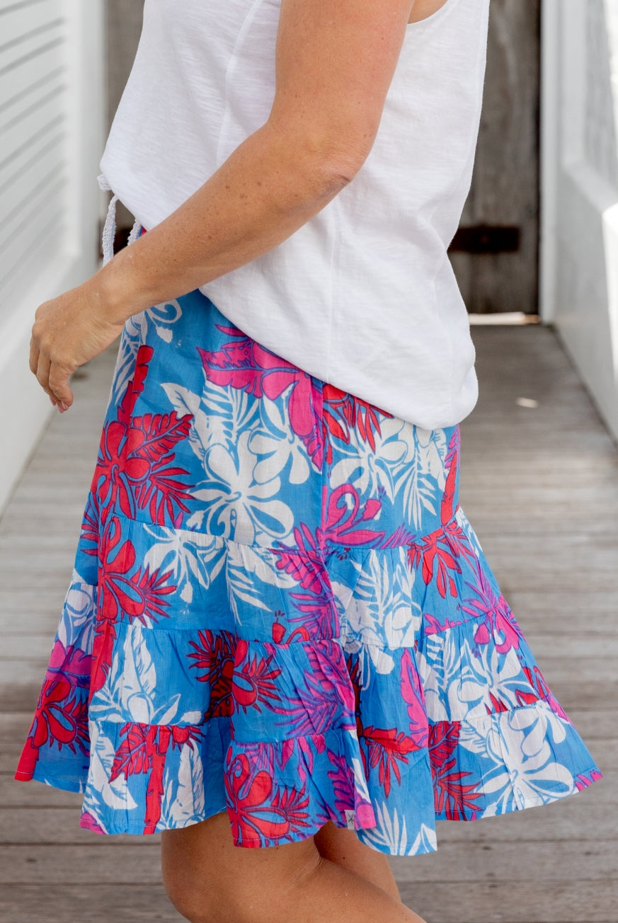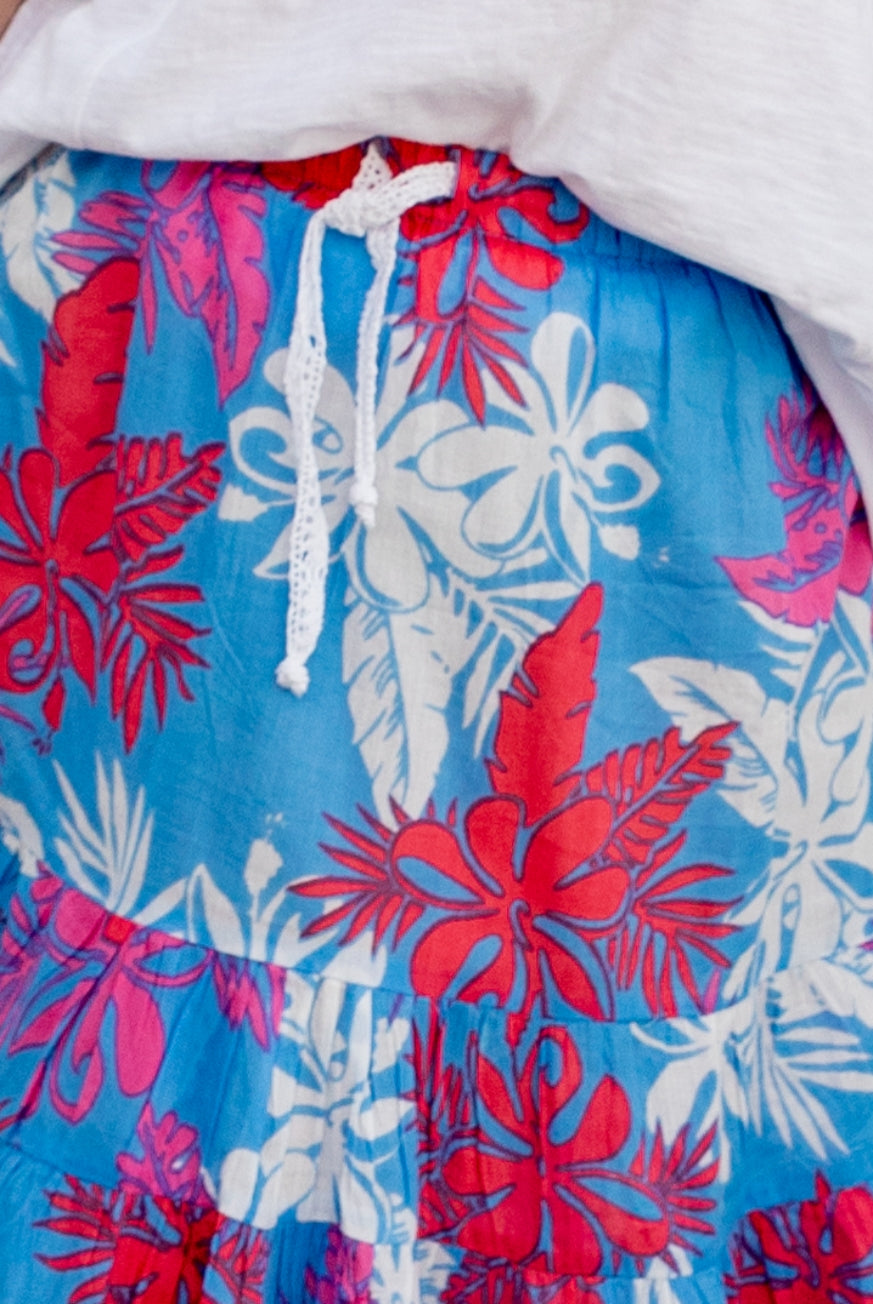 Lightweight cotton ruffle skirt with adorable hibiscus print. Elasticated waistband with functional cotton drawcord. You will feel super comfortable in this skirt and its fun and flirty... yet still confident and stylish, instead of hot and sweaty!.