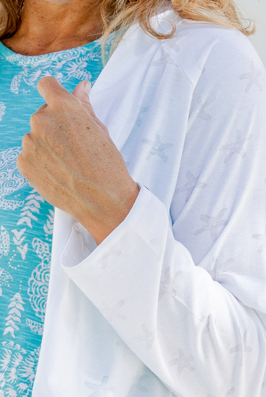 Our Starfish Burnout Cardi is made from lightweight, breathable cotton with a burnout texture — perfect for layering in warm climates.
