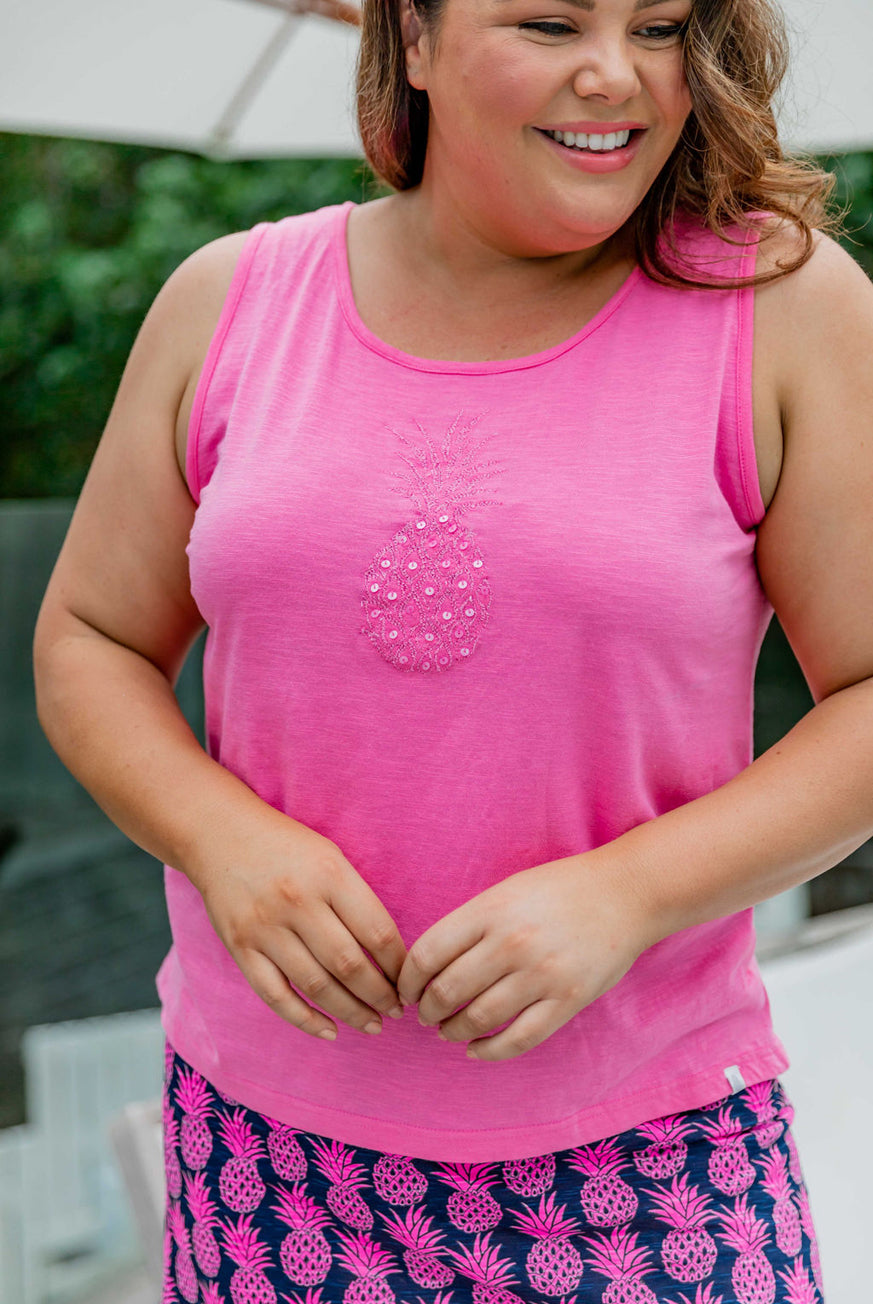 Cotton casual tank top comes in 2 different colors, designed to match back to our pineapple bottoms. This cute pure cotton tank top features a pineapple embroidery with sparkly sequins.