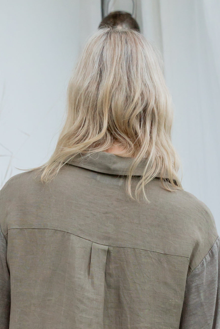 The shape of this dress is a loose straight silhouette, which is so flattering to wear. Placket front with shell buttons, and linen textured knit sleeves, that tie at the cuff.